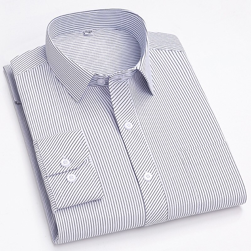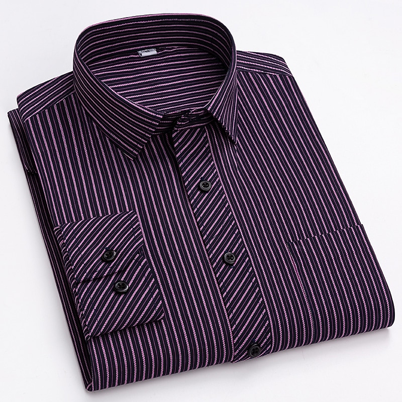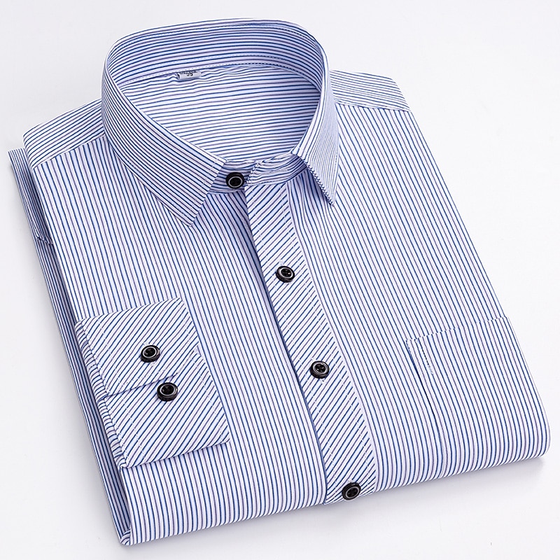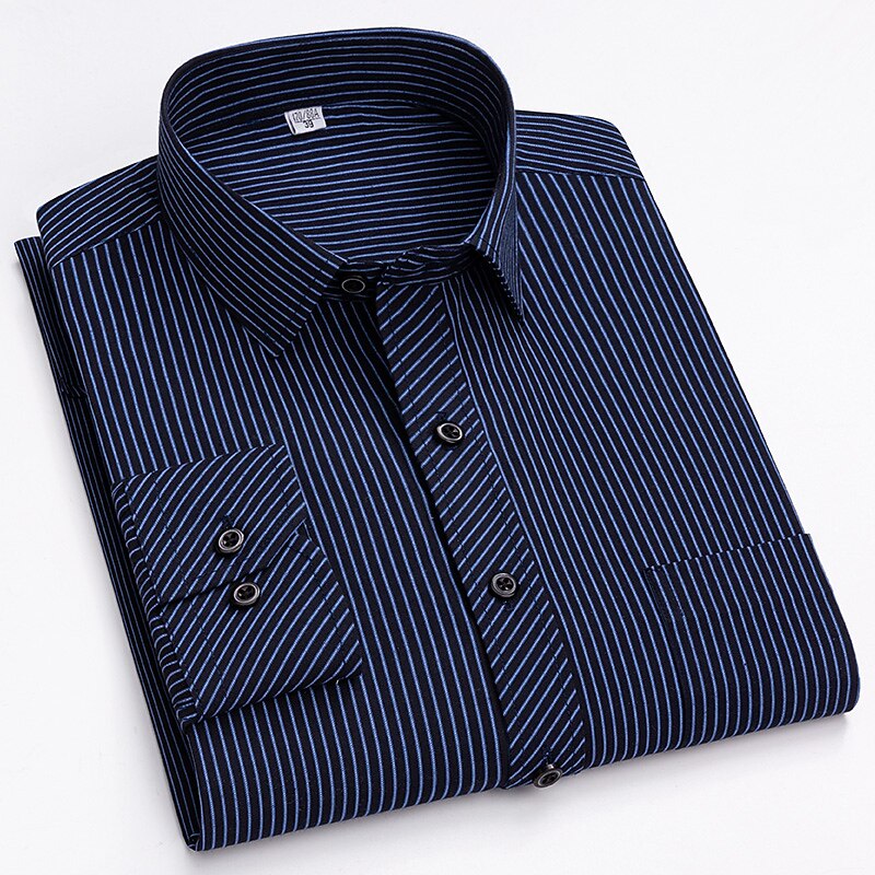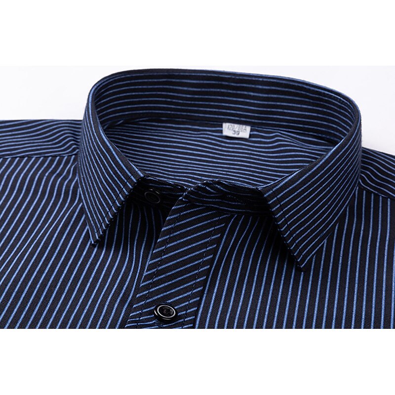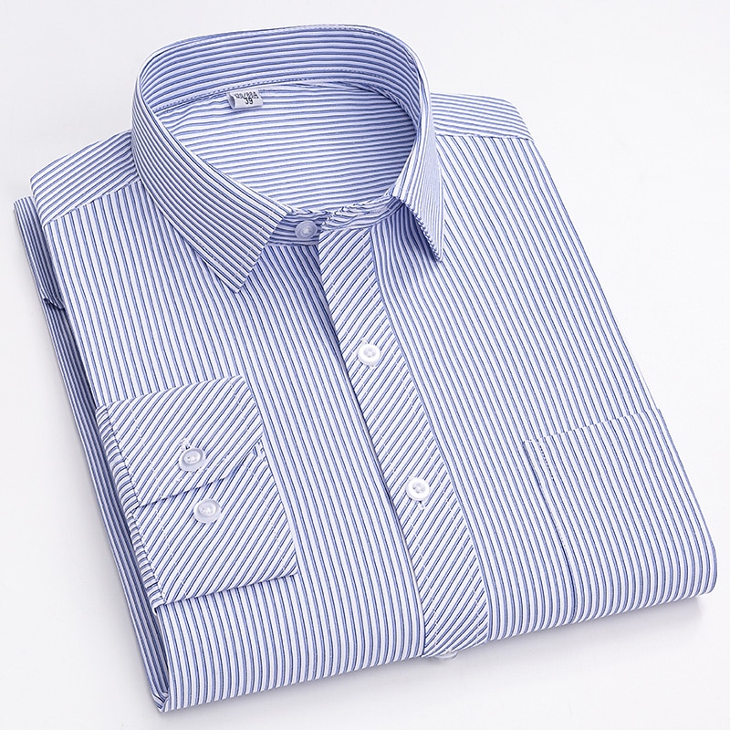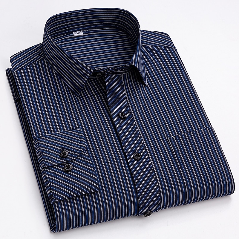 Highlights [Fabric & Fit:] Crafted from a comfortable and durable blend of 65% polyester and 35% cotton, this men's dress shirt offers a lightweight feel perfect for all seasons. The slim-fit design emphasizes a sleek, tailored look, ensuring you look sharp on any occasion. [Design Highlights:] This shirt is styled with a classic collared neckline and long sleeves featuring buttoned cuffs, adding a refined touch. The sophisticated navy blue shade with elegant vertical pinstripes provides a modern twist to a traditional look. A functional front chest pocket adds practicality without sacrificing style. [Occasions:] Whether you’re headed to a wedding, a day at the office, or just a casual outing, this versatile dress shirt adapts effortlessly. Pair it with dress pants for a formal setting or jeans for a more relaxed yet classy appearance. [Size Range:] Available in sizes ranging from S to 2XL, catering to a wide range of fits and preferences, ensuring every man can find his perfect fit. [Care Instructions:] Easy to care for, this shirt is machine washable, maintaining convenience and a crisp appearance with its non-iron fabric.
