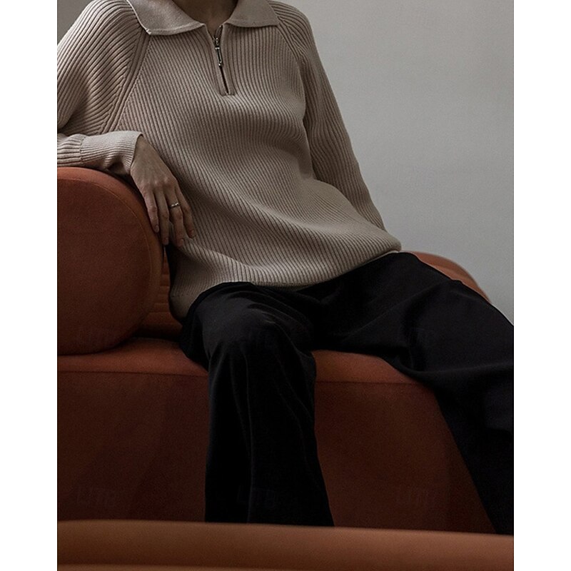 Women's Sweater Pullover Daily Stylish Casual Solid Color Ribbed Shirt Collar Zipper Knitted Long Sleeve Regular Tops Knit Daily Holiday Going out Pink Red Fall Winter 11