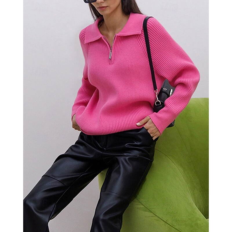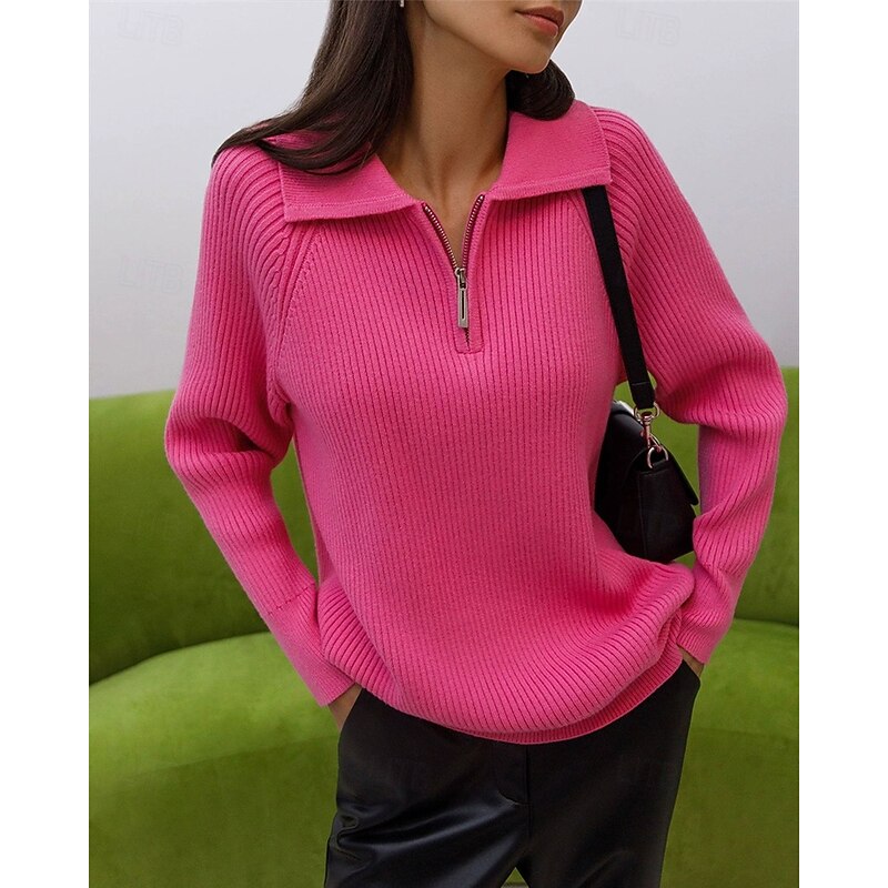 HOT ! Women's Sweater Pullover Daily Stylish Casual Solid Color Ribbed Shirt Collar Zipper Knitted Long Sleeve Regular Tops Knit Daily Holiday Going out Pink Red Fall Winter