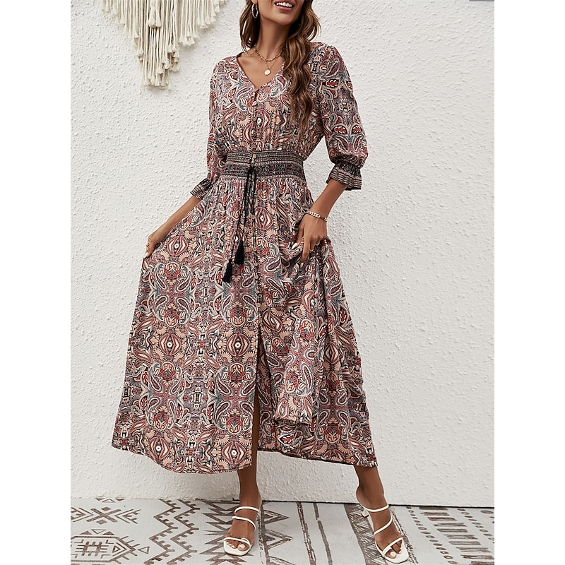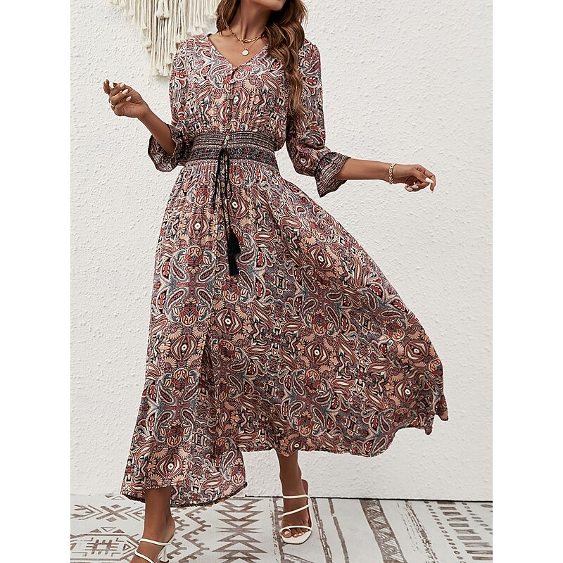 More information about Women's Maxi Dress Casual Dress Long Sleeve Boho Dress Boho Dress Bohemia Stylish Basic Vacation Casual Daily Regular Fit Graphic 3/4 Length Sleeve V Neck Maroon Blue Summer Spring Fall