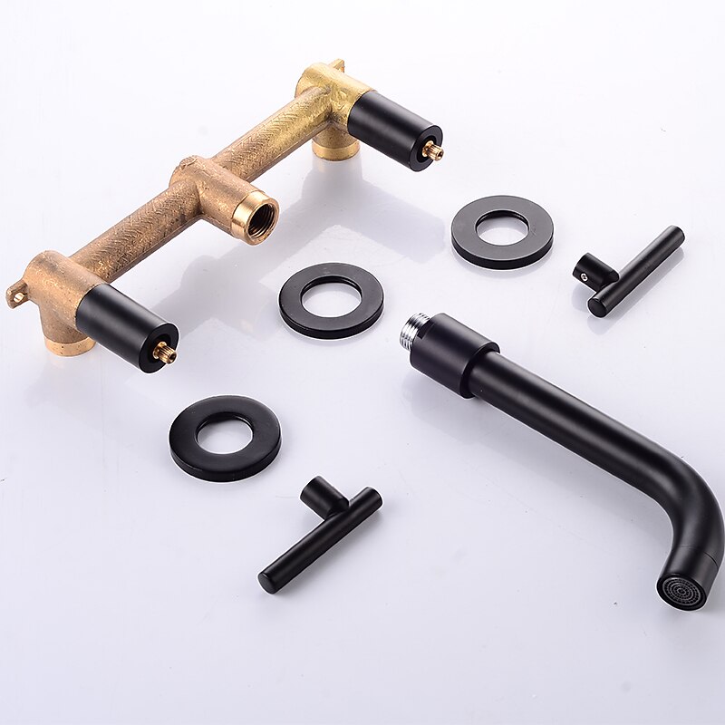 Bathroom Sink Mixer Faucet Wall Mounted, 2 Handle 3 Hole Wash Baxin Brass Taps, Rough in Valve Washroom Basin Tap 1