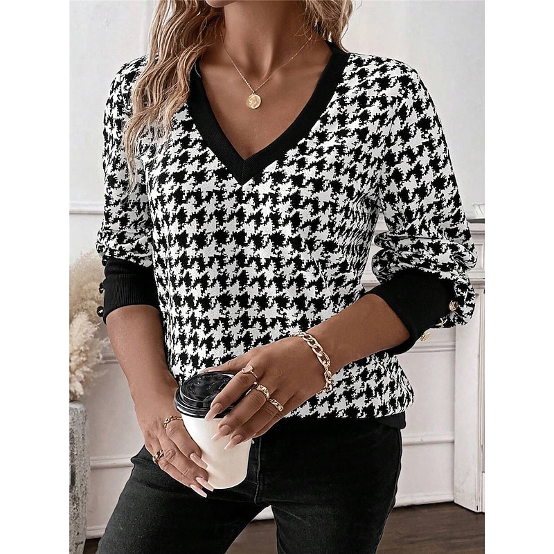 Highlights [Fabric] : This women's long sleeve T-shirt is crafted from high-quality polyester, ensuring durability and comfort. The material is soft, offering a micro-elastic fit that comfortably adapts to your body for ease of movement. [Fit] : With its regular fit design, this shirt provides a comfortable balance that flatters your figure without being too tight or too loose. The regular top length makes it versatile for layering or wearing alone. [Design Highlights] : Featuring a classic V-neckline and a timeless black and white houndstooth pattern, this shirt is accented with solid black trim on the neckline and cuffs. This contrasting detail adds a contemporary touch to the traditional pattern, enhancing the overall stylish design. [Occasions] : Perfect for daily wear, weekend outings, or casual office settings, this shirt is a versatile addition to your fall and winter wardrobe. Whether paired with jeans for a relaxed look or trousers for a more polished outfit, it suits a variety of occasions. [Size] : Available in sizes S, M, L, and XL, this T-shirt offers a range of fits to accommodate different body types. Please refer to the size chart to find the best fit for you.