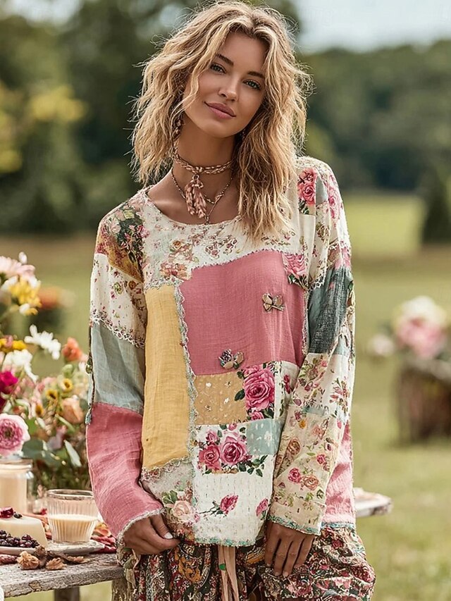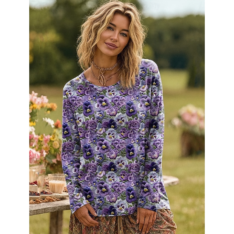 More information about Women's Plus Size T Shirt Floral Color Gradient Oil painting flowers Basic Long Sleeve Crew Neck Regular Tops Daily Going out Weekend Print Pink Red Blue Purple Green Spring Fall Prefall