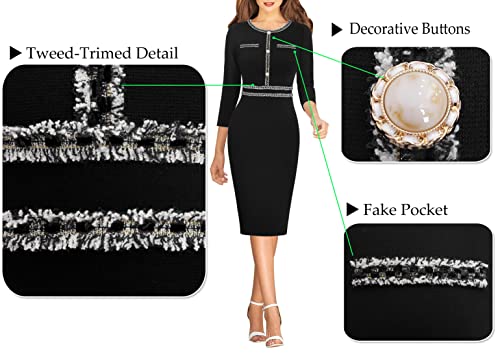 • Style: Crew Neckline, 3/4 Sleeve, Tweed Trim with Metallic Stitching Design, Front unmovable Buttons Embellishment, Slim Fitting, Knee Length Pencil Dress, Sheath Silhouette, A Concealed Back Zipper, Back Slit for easy walking.