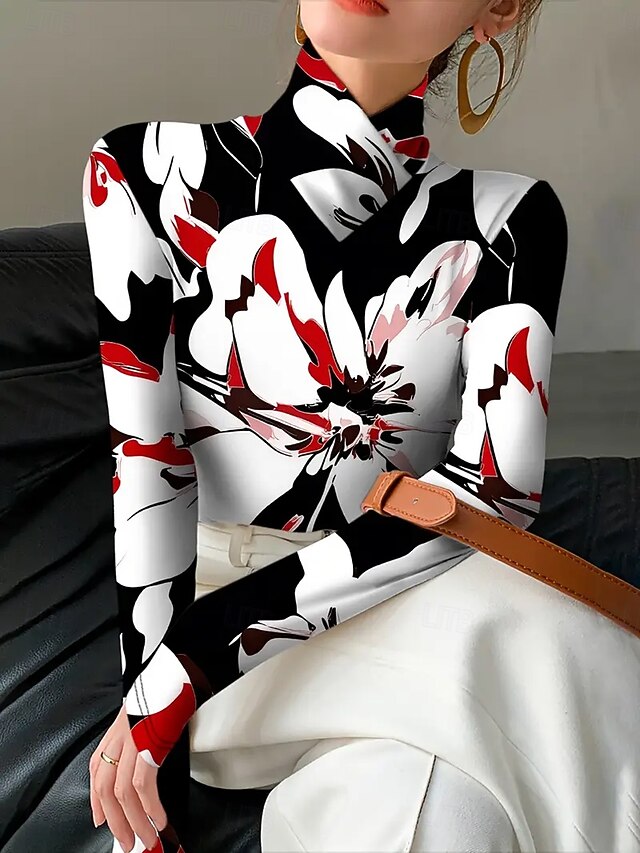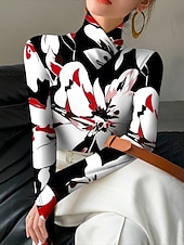 More information about Women's T Shirt Floral Graphic Elegant Vintage Stylish Long Sleeve Turtleneck High Neck Asymmetric Neck Regular Tops Daily Print Tiered Red Green Spring Fall Winter