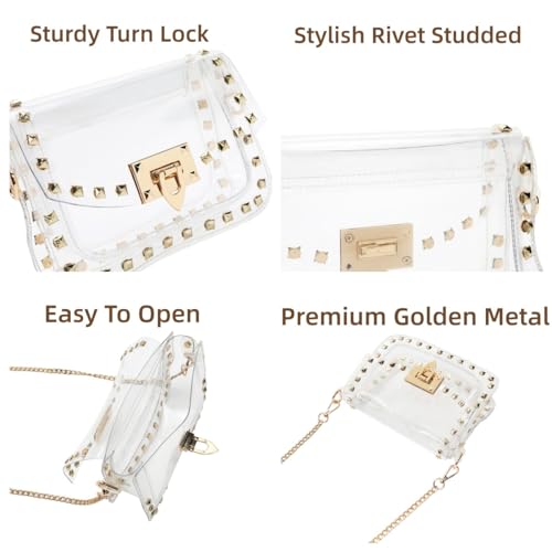 • 【Rivet Decor & Removable Crossbody Strap】: This clear handbag is stylish designed by gold-tone rivet, you can wear it as clear shoulder bag, clear clutch, clear crossbody bag, which comes with 47" detachable gold metal chain strap.