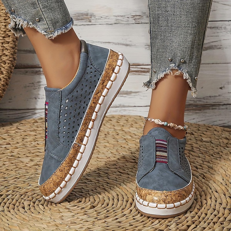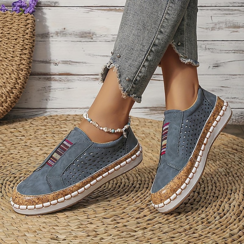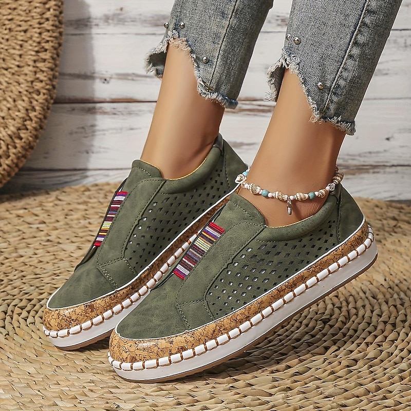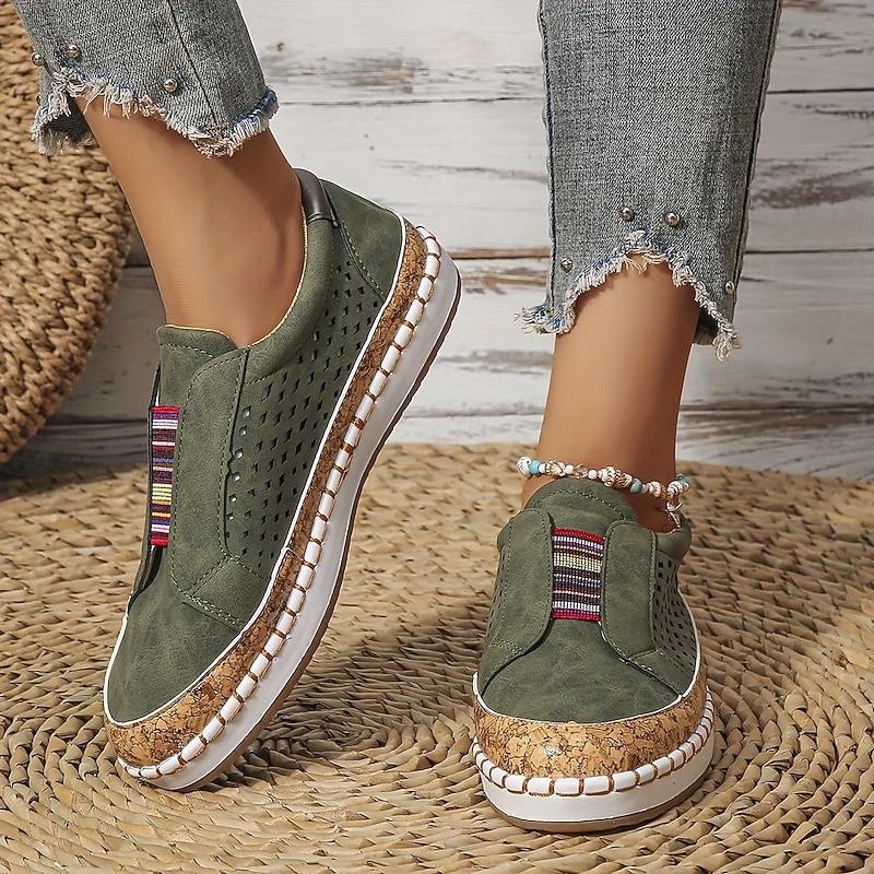 Highlights [Fabric & Style] : Crafted with high-quality PU material, these women's flat slip-on loafers are designed with a flat heel, making them ideal for comfortable wear throughout summer. The round toe shape offers a casual vintage style while maintaining a modern and breathable aesthetic with a beautifully perforated white upper. [Design Highlights] : This chic pair of slip-ons features colorful elastic bands across the upper, offering a secure yet flexible fit. The standout cork-textured midsole adds a touch of natural elegance to the design, while the robust rubber outsole ensures durability and sufficient cushioning for everyday comfort. [Occasions] : Perfect for daily wear and outdoor activities, these loafers are designed to be versatile and stylish for a variety of occasions. Whether you’re taking a leisurely walk or heading out for a casual day, these shoes provide the perfect blend of style and comfort. [Usage Scene] : Suitable for walking and casual outings, these slip-on loafers will keep you comfortable and stylish all day long. They are perfect for summer activities, ensuring breathability and ease with every step. [Size Notice] : Available in a range of sizes from US6 to US10.5, these loafers cater to a wide variety of foot sizes, ensuring a good fit and comfortable experience. Please refer to the size chart for accurate sizing selection.