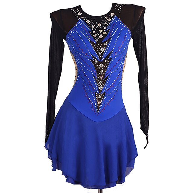 Figure Skating Dress Women's Girls' Ice Skating Dress Royal Blue Patchwork Open Back Mesh Spandex High Elasticity Training Competition Skating Wear Classic Long Sleeve Ice Skating Figure Skating 10