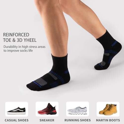 • [CUSHIONED MENS SOCKS ANKLE]: These cotton mens ankle socks have soft cushion on the toe and bottom with thicker yarn, which can reduce impact and friction, avoid blisters during running and sports. These ankle athletic socks men fit US men's shoe size 6-12, mens socks size 10-13.