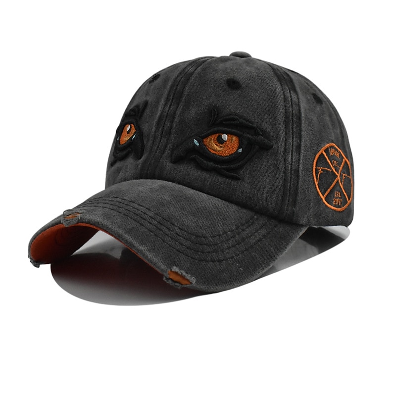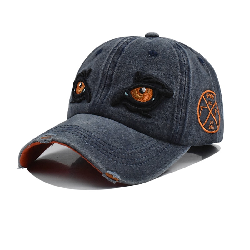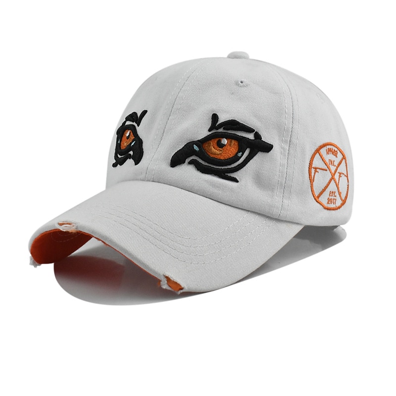 Highlights [Fabric:] Crafted from high-quality cotton, this unisex baseball cap offers both comfort and durability, making it perfect for extended wear during various seasons like summer, spring, and fall. [Fit:] The cap boasts a classic six-panel design with a pre-curved visor, giving it a timeless and casual appeal. It features an adjustable strap at the back, ensuring a comfortable fit for all head sizes. [Design Highlights:] What makes this cap distinct is its unique embroidered design of expressive eyes on the front, adding a bold and edgy touch. The distressed detailing along the brim enhances its vintage look, while the orange embroidered emblem on the side adds a vibrant pop of color. [Occasions:] Perfect for various occasions such as vacations and outdoor activities, this cap complements a range of styles from beach and travel attire to casual, everyday outfits. Its versatile design makes it suitable for any leisurely outing. [Size Range:] Offered in a one-size-fits-all, this cap is adjustable to accommodate different head sizes, ensuring a snug yet comfortable fit for everyone. Available in multiple color options, including white, black, and dark navy, it can effortlessly match a variety of wardrobe choices.
