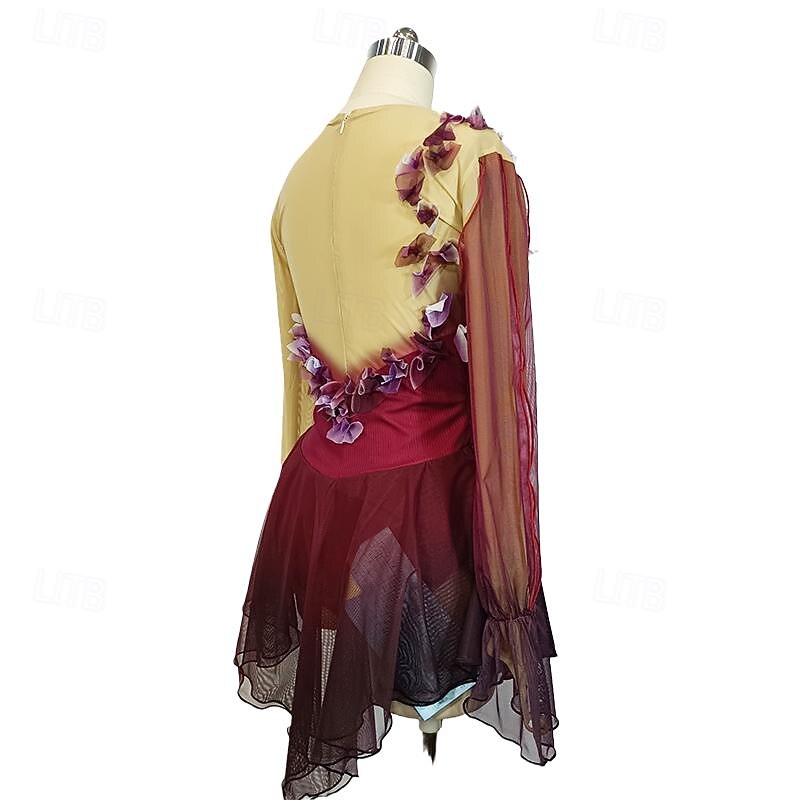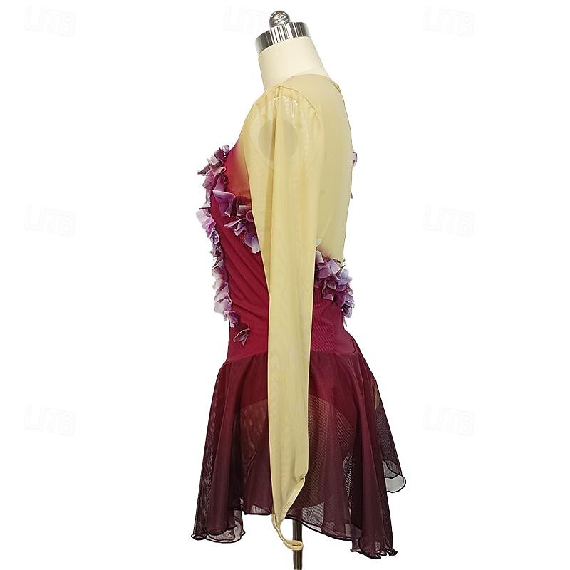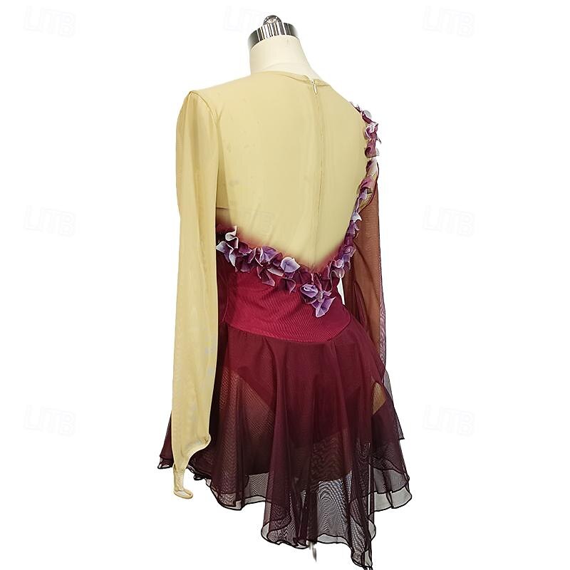 More information about Figure Skating Dress Women's Girls' Ice Skating Dress Burgundy Patchwork Thumbhole Mesh Spandex Stretchy Training Practice Professional Skating Wear Crystal / Rhinestone Long Sleeve Ice Skating