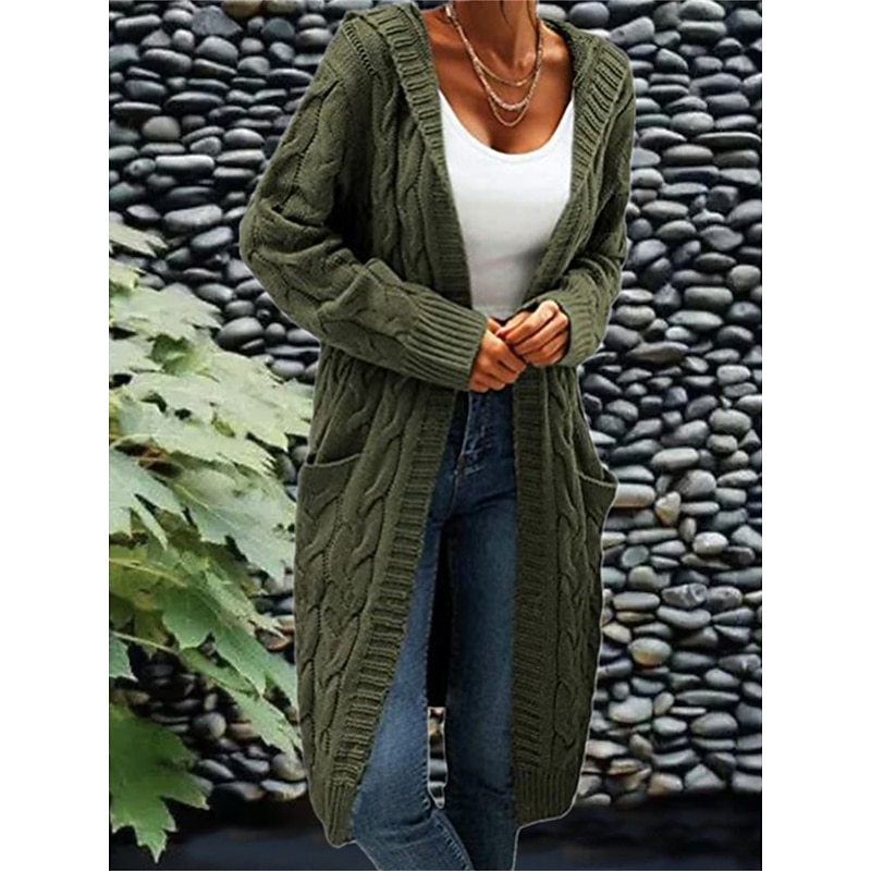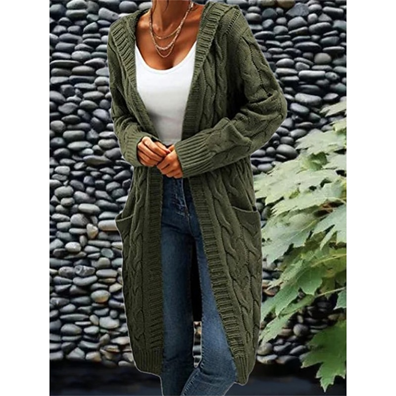 Highlights [Fabric] : Crafted from a soft polyester blend, this women's cardigan is designed to be both comfortable and stylish. The cozy, thick knit features a textured cable pattern, enhancing its warmth and visual appeal. [Fit] : The cardigan sports a long, open-front style that extends below the hips, offering a relaxed and regular fit, perfect for layering during the fall and winter seasons. [Design Highlights] : This cardigan includes functional features like long sleeves and two front pockets. The hooded neckline adds a casual streetwear element, making it ideal for a laid-back yet fashionable look. [Occasions] : Suitable for a range of settings including daily wear, going out, and outdoor activities. Whether you're heading to a weekend gathering or simply running errands, this cardigan seamlessly balances style and comfort. [Size Information] : Available in multiple colors—Dark Gray, Purple, Wine, and Army Green—and sizes S, M, L, and XL, offering versatility and a fitting option for various preferences.