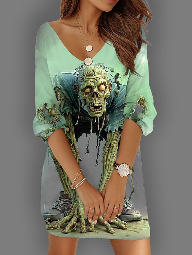 Halloween Women's Skulls Print Mini Dress Shift Dress Vacation Casual Daily Holiday Cocktail Party Loose Fit Graphic Skull Long Sleeve V Neck Yellow Blue Purple Green Summer Spring Fall Autumn 13