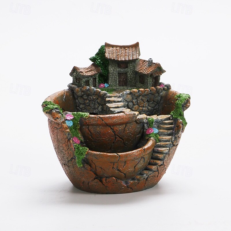 1pc Magic Garden Planting Pot - Fantasy Fairy House Design with stone walls ladders colorful flowers resin succulents and flower pots mini landscape containers for indoor and outdoor decoration 1