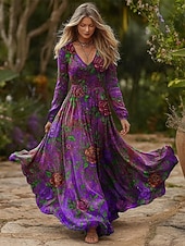 More information about Women's Maxi Dress Pleated Dress Party Casual Boho Daily Date Going out Regular Fit Floral Graphic Long Sleeve V Neck Blue Fuchsia Spring Fall Winter