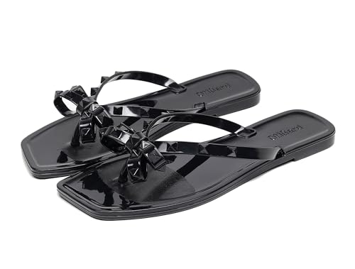 More information about Studded Sandals for Womens Bow Flip Flops Jelly Shoes Beige Jellies Flat Size 9, Summer Beach Thong Slides with Rivets Dress Slippers Square Toe Slip On