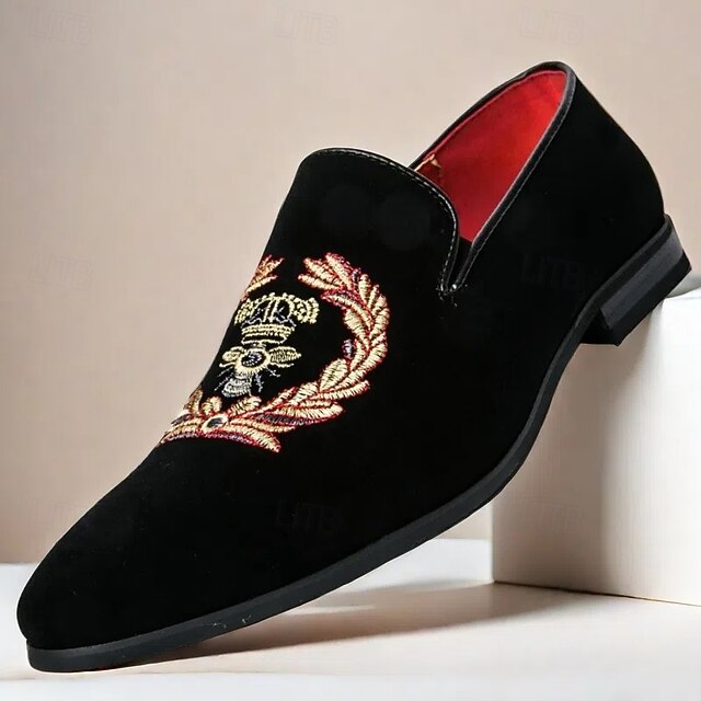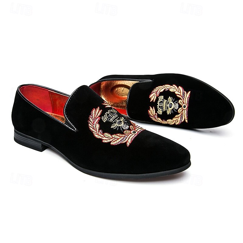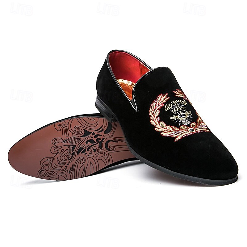 Highlights [Fabric] These men's loafers are crafted from luxurious black velvet, offering a sleek texture that elevates the overall sophistication of the shoe. The velvet material not only adds elegance but also ensures durability and comfort throughout wear. [Fit and Style] Featuring a classic slip-on design, these loafers provide a comfortable and convenient fit. The round toe shape and traditional craftsmanship create a timeless style that seamlessly blends with modern fashion sensibilities. [Design Highlights] The upper is intricately embroidered with a regal crown motif in gold and red hues. This detailed embroidery adds a touch of distinction and class, making these loafers a standout choice for those seeking to make a bold fashion statement. The vibrant red interior lining adds an unexpected pop of color and enhances comfort. [Occasions] Perfect for formal events, parties, and special occasions, these loafers can be paired with a variety of formal outfits. Whether attending a wedding, gala, or festive gathering, these shoes provide both style and sophistication. [Size Range] Available in a range of sizes from US6-6.5 / EU38 / UK5-5.5 to US10.5 / EU43 / UK9.5, these loafers cater to various foot sizes, ensuring a great fit for a wide audience.