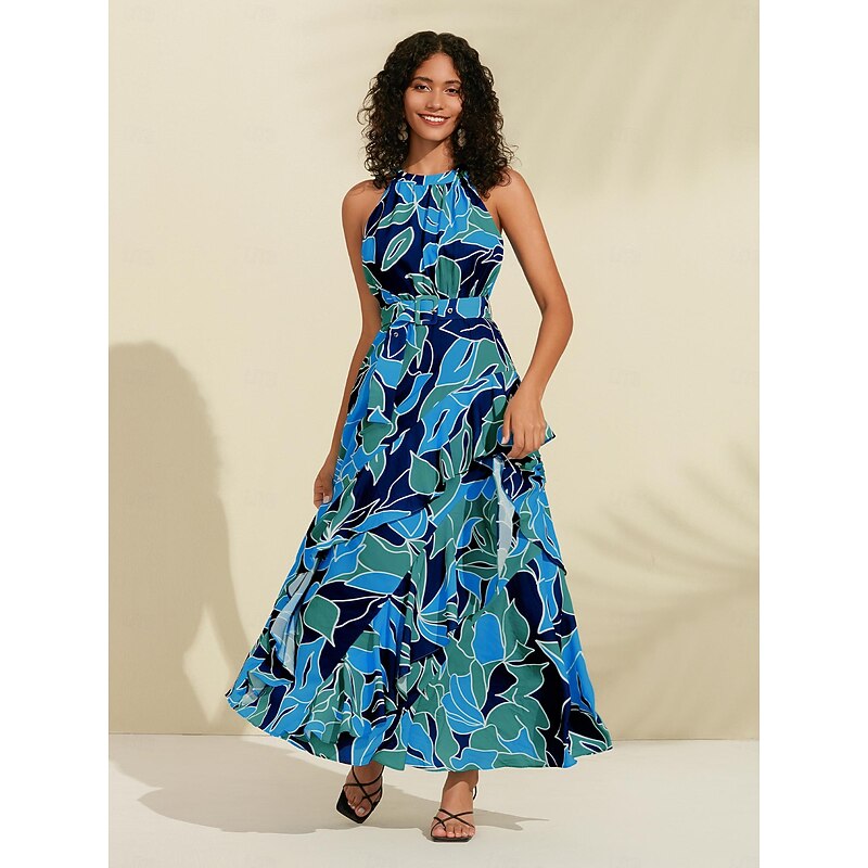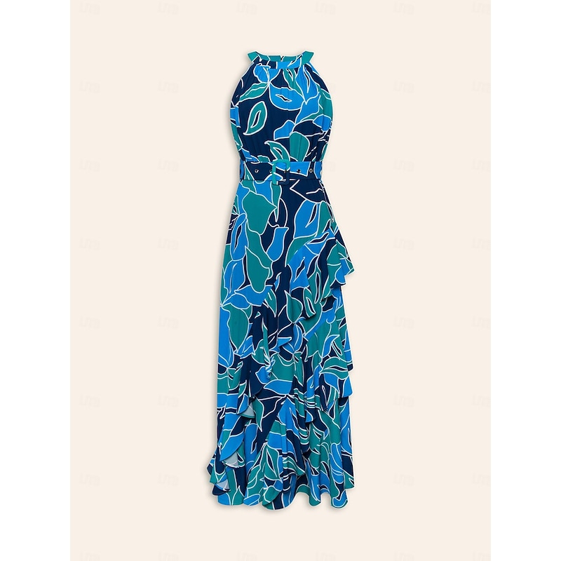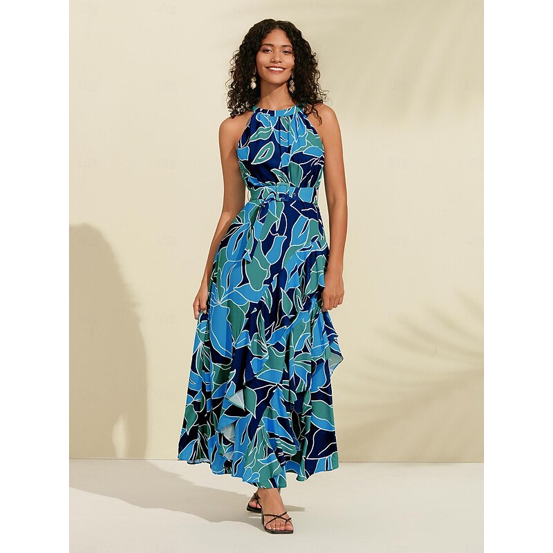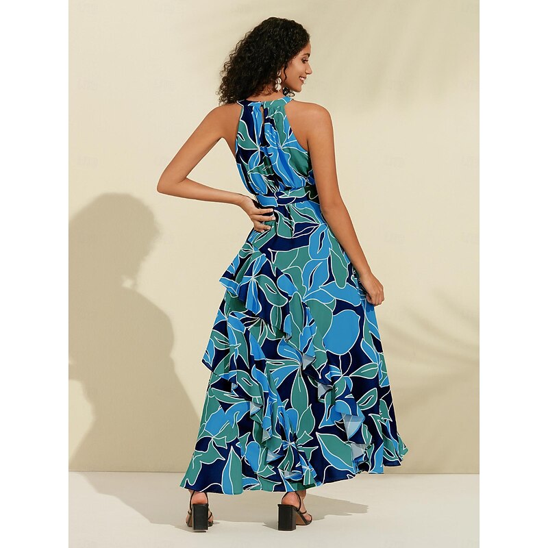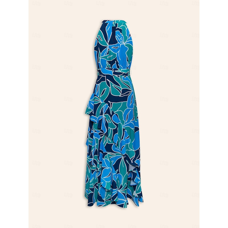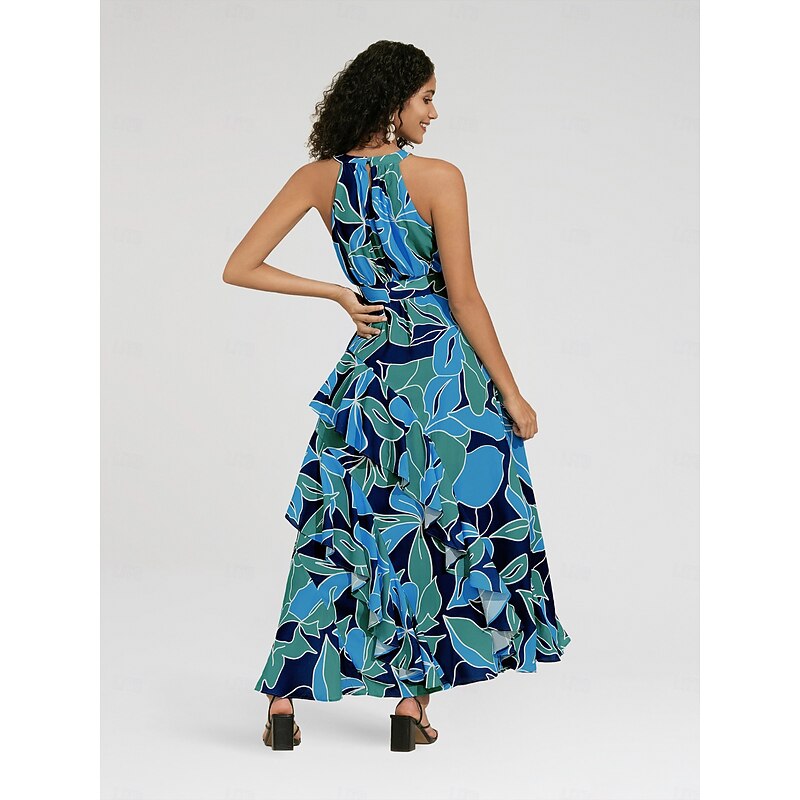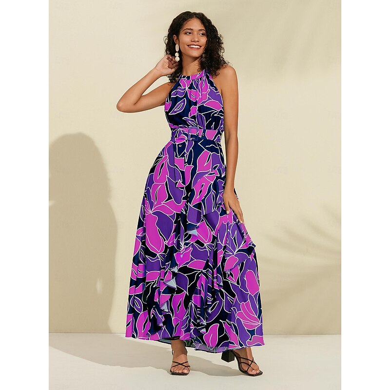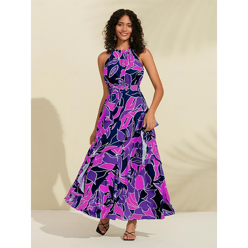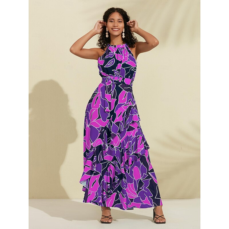 Women's Chiffon Dress Maxi Dress Blue Purple Sleeveless Floral Ruffle Printing Spring & Summer Round Pattern Dress XS S M 20