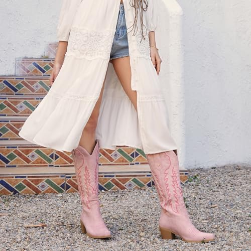 wetkiss Cowboy Boots for Women Knee High Cowgirl Boots Retro Embroidered Chunky Heels Pointed Toe Western Long Tall Boot Pull On 5
