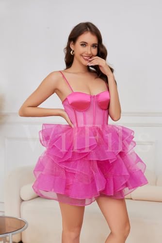 • WilFiks Homecoming Dress Feature:Glitter/Sparkly Tulle fabic,Soft and Skin-Friendly,Spaghetti Straps,Sweetheart Neck,Sleeveless,Chest is Soft Silk Satin,Sheer Waist with Fishbone,Corset,Fluffy Ruffled Layered Hemline,Backless,Lace-Up Back,A Line,Above Knee Length,Built in Bra.