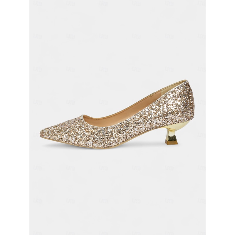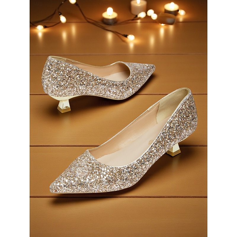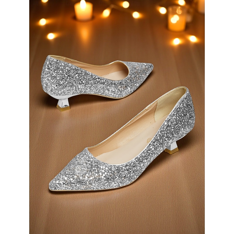 HOT ! Women's Glitter Low Heel Pointed Toe Pumps - Sparkly Slip-On Dress Shoes for Cocktail Parties, Weddings & Evening Events