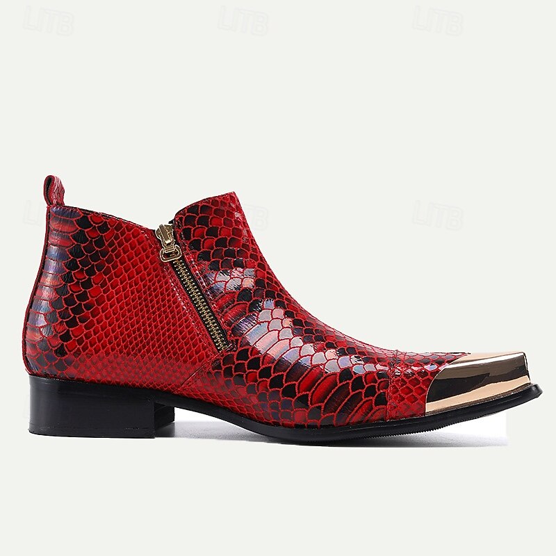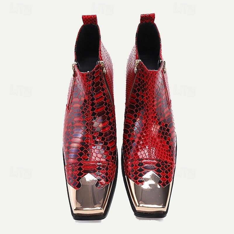 HOT ! Men's Red Snakeskin Leather Ankle Boots with Metallic Toe Cap – Bold Fashion Statement for Parties and Events