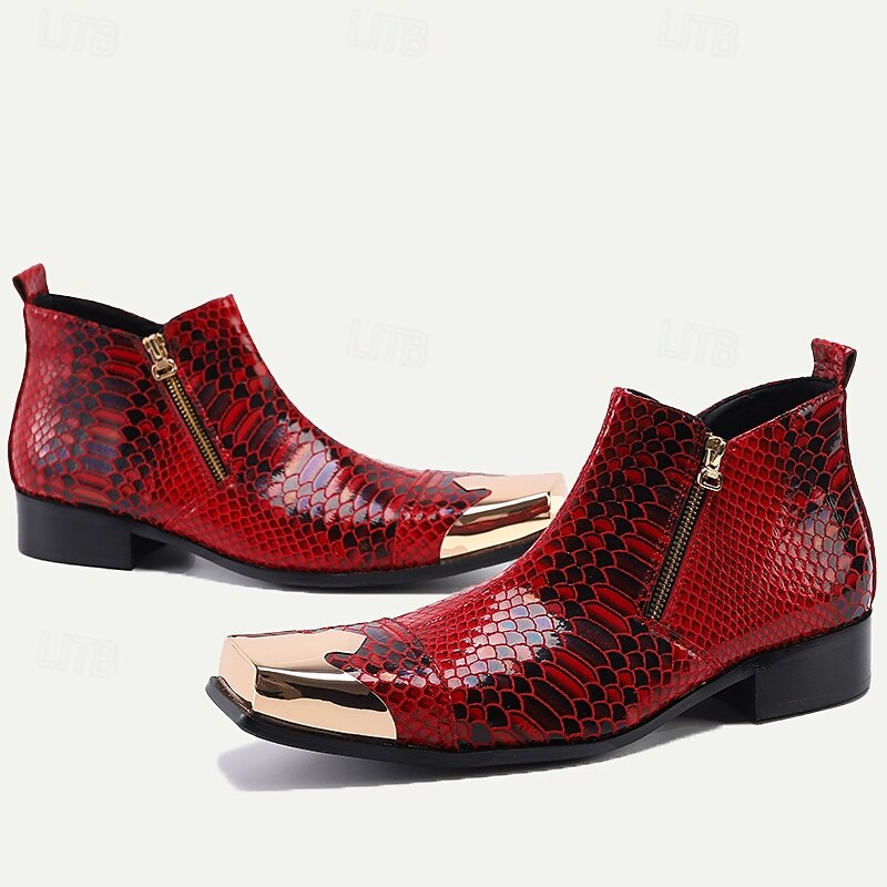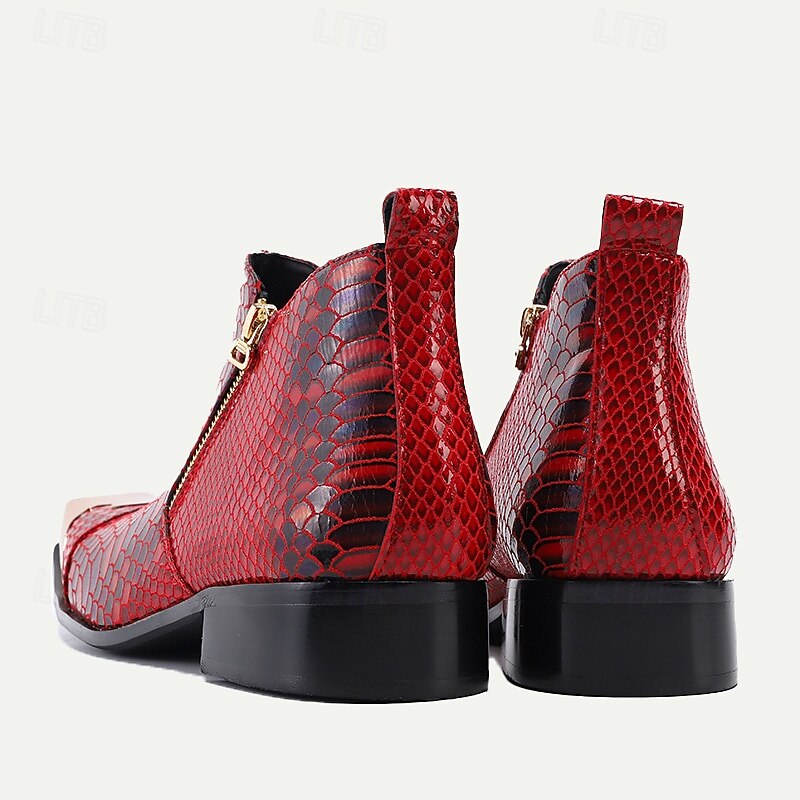 Highlights [Fabric] : The boots are crafted from high-quality cowhide leather with a striking red faux snakeskin texture, offering a luxurious and durable finish. [Silhouette] : Designed in a stylish ankle boot silhouette, these boots provide a modern and elegant appearance suitable for making a fashion statement. [Design Highlights] : These boots feature a distinctive metallic pointed toe cap that adds a touch of sophistication and boldness. The convenient side zipper ensures ease of wear and removal, while the robust rubber sole offers slip resistance and stability. [Occasions] : Perfect for parties, events, and both casual and formal occasions, these boots are ideal for those who want to stand out with a unique style. They provide the perfect balance of comfort and flair, making them suitable for daily wear during the fall and winter seasons. [Size Range] : Available in a range of sizes from US6 / EU39 / UK5 to US13 / EU46 / UK12, ensuring a perfect fit for a wide spectrum of customers.