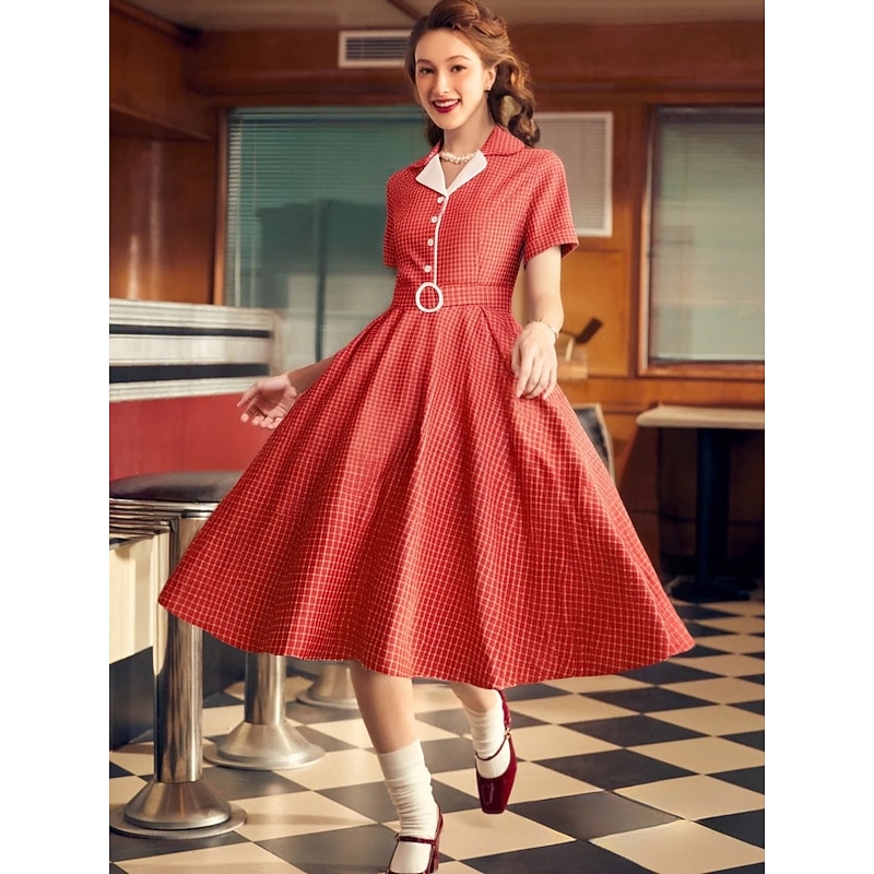 Retro Vintage 1950s Rockabilly Knee Length Swing Dress Flare Dress Shirt Dress With Belt Plaid Fancy Dress Women's Carnival Masquerade Tea Party Casual Daily Retro Theme Party Adults' Dress Spring 1