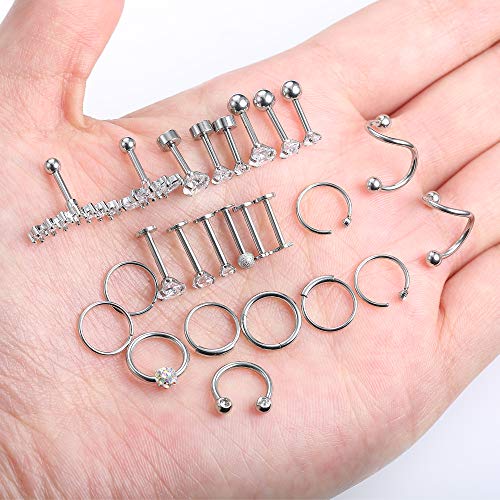 • 💃[AFFORDABLE CARTILAGE EARRING SET]: Come with 25pcs cartilage piercing a set, including septum ring; hinged cliker ring, C shaped rings, ball back cartilage earrings, falt back cartilage earrings, labret rings, cartilage wrap earrings.
