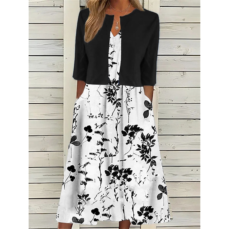 : Featuring a chic pocket design and a delicate floral print, the dress adds a touch of sophistication to its casual style. The crew neckline enhances its elegant design, while the jacket provides an additional layer of class to the overall look.