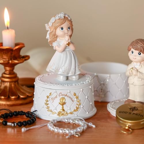 First Communion Gifts for Girls- First Holy Girl Figurine with Keepsake Box & Flower Girl Headpiece & Cross Necklace & Cross Bracelet Included, 1st Communion Gifts for Girls 1