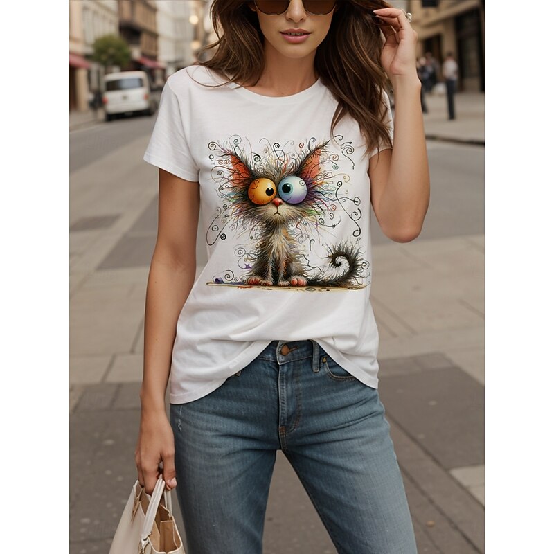 More information about Women's T Shirt Graphic Animal Cat Vintage Stylish Classic Short Sleeve Crew Neck Round Neck Regular Tops Daily Weekend Print White Summer Spring