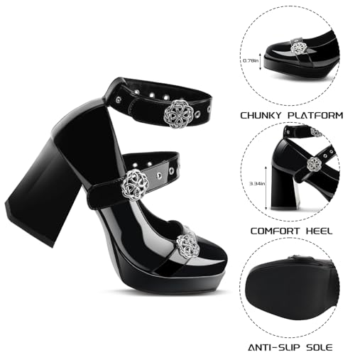 More information about Women Chunky Platform Mary Jane Heels with Hook & Loop Closed Toe Patent Leather Goth Shoes Ankle Strap Pumps