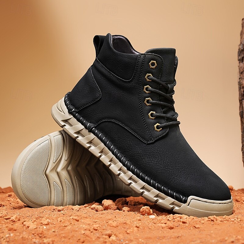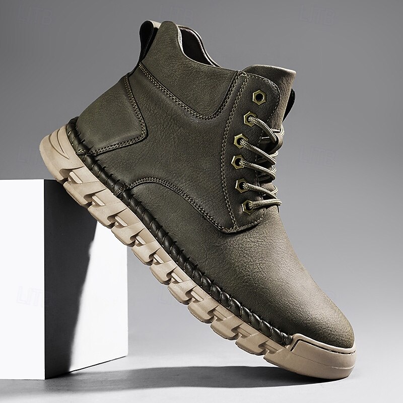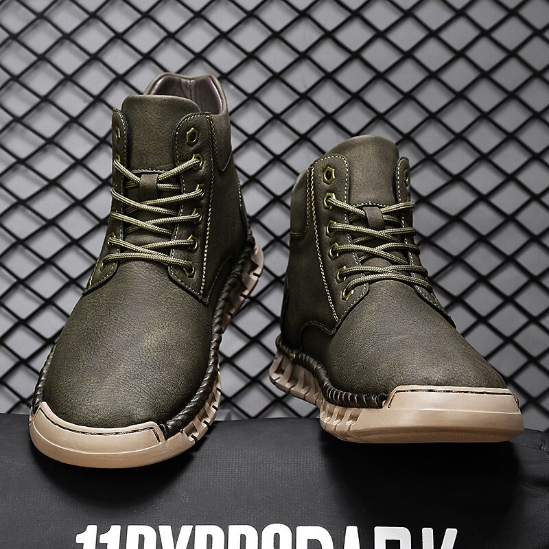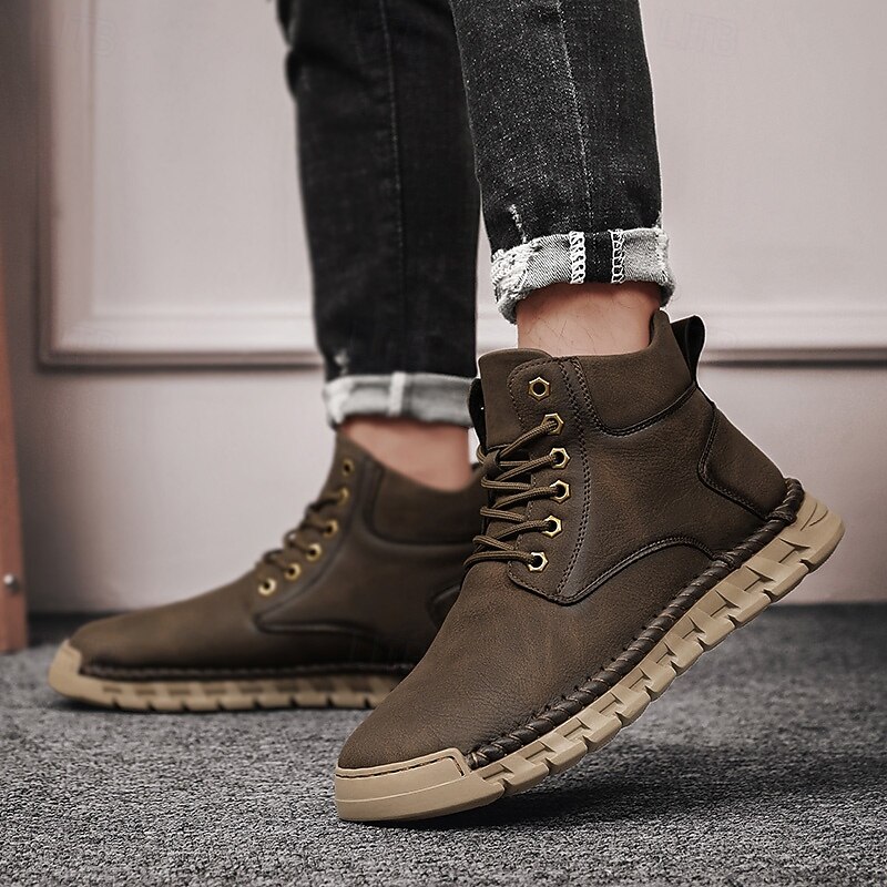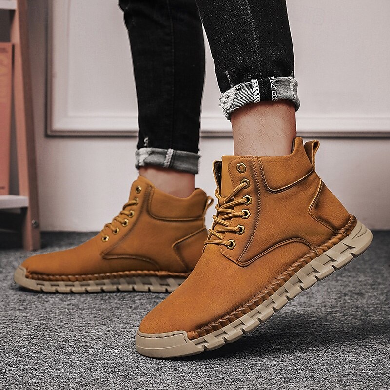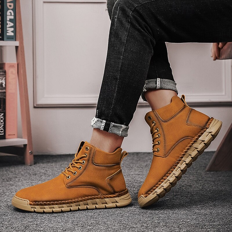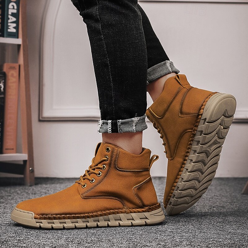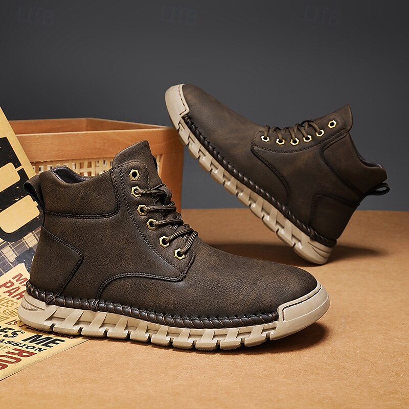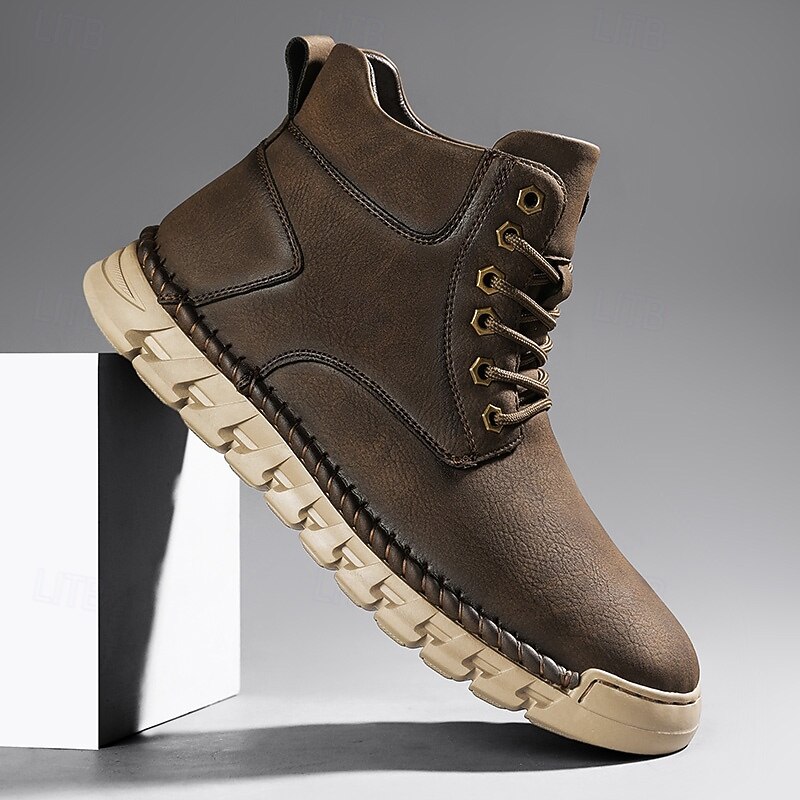 Men's Casual Faux Leather Ankle Boots - Lightweight Brown Lace-Up with Durable Flexible Sole for Outdoor and Everyday Wear