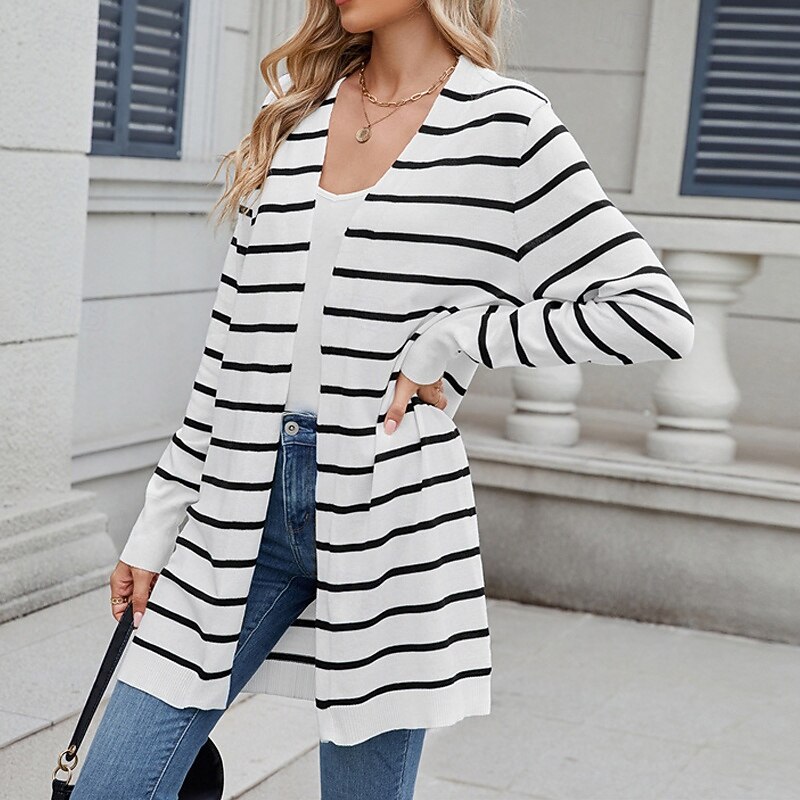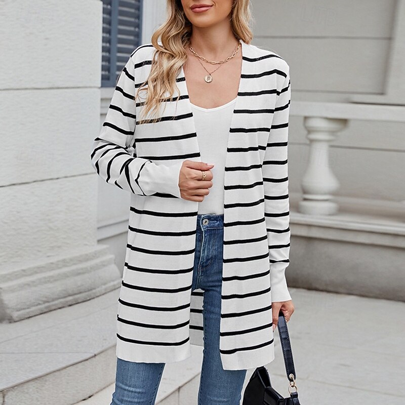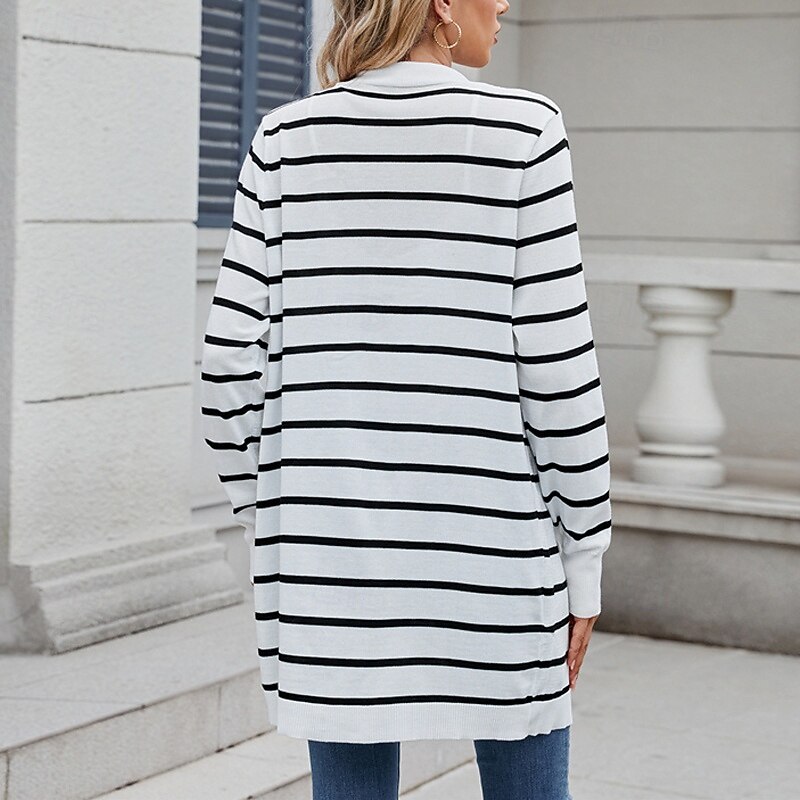 Women's Sweater Cardigan Fashion Streetwear Daily Striped Ribbed Open Front Knitted Long Sleeve Long Tops Knit Holiday Going out Weekend White / Black Black Fall Winter 11
