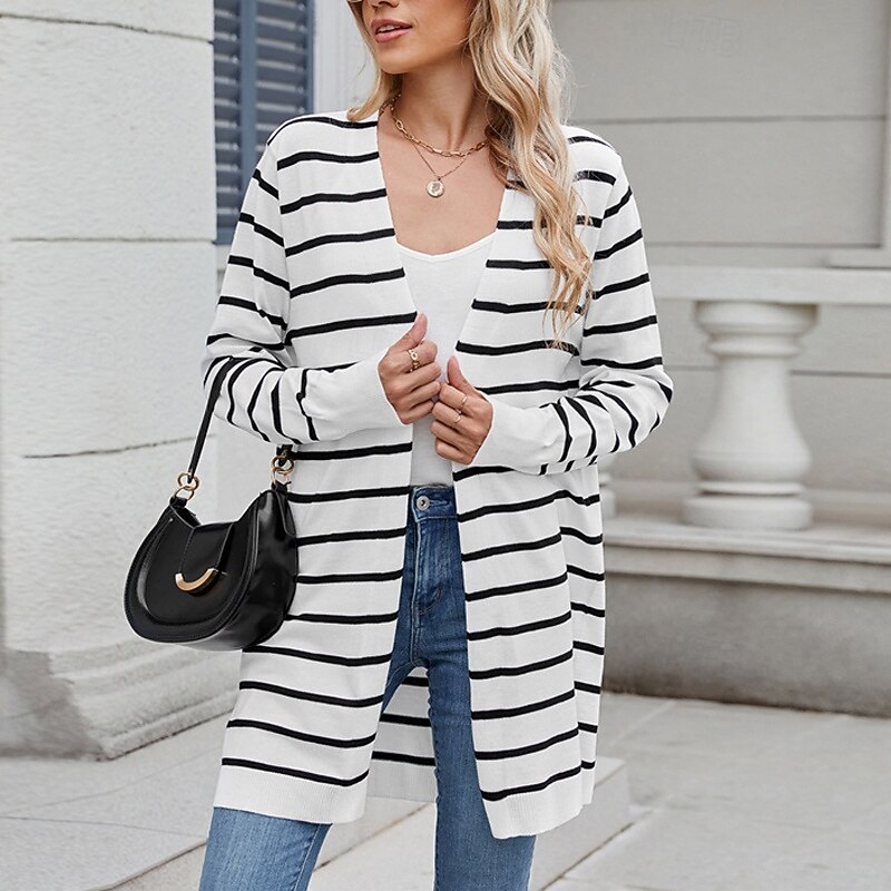 Women's Sweater Cardigan Fashion Streetwear Daily Striped Ribbed Open Front Knitted Long Sleeve Long Tops Knit Holiday Going out Weekend White / Black Black Fall Winter 10