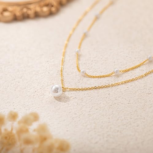 Pearl Necklace for Women, Dainty 14K Gold Plated Layered Pearls Chain Set, Trendy Stack Beaded Charm Simple Link Choker Necklace Jewelry Gift for Wedding Prom Statement Summer 2