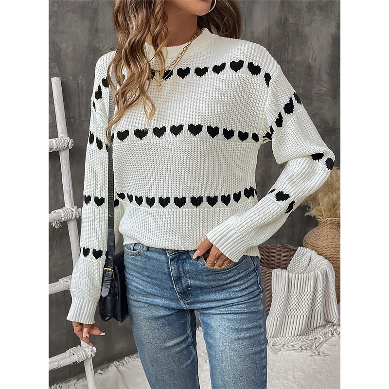 Women's Sweater Casual Soft Heart Ribbed Crew Neck Knitted Long Sleeve Regular Tops Knit Outdoor Daily Weekend White Fall Winter 1