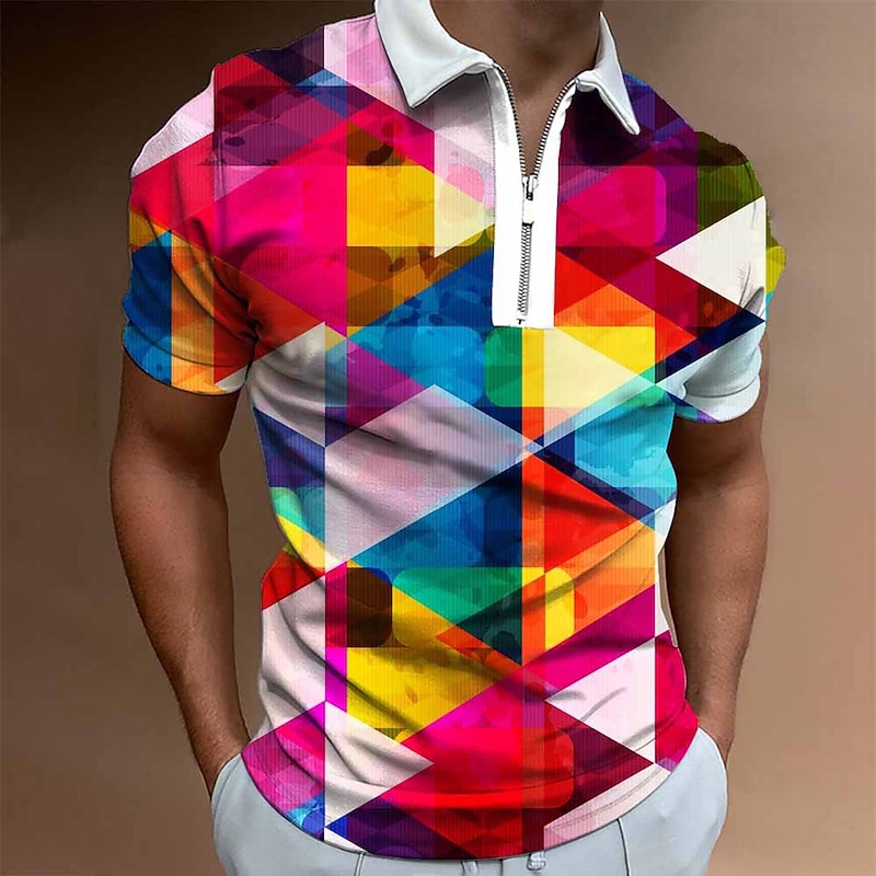Men's Graphic Zip Polo Shirts Golf Shirt Short Sleeve Polo Shirts Collared Shirts Casual Vacation Wear Rave Wear Party Outfits 3D Print Quarter Zip Polo White Yellow Pink 13
