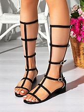HOT ! Women's Black Gladiator Knee-High Sandals – Strappy Roman Style with Low Block Heel for Music Festivals & Summer Outings