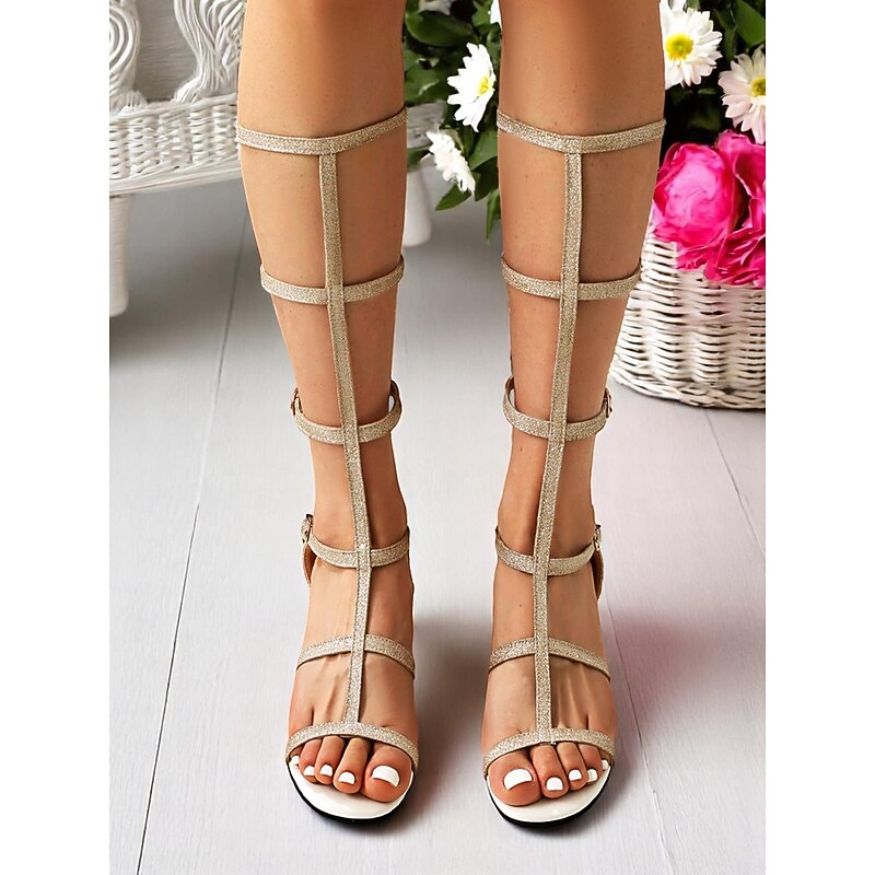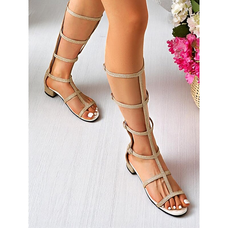 Women's Black Gladiator Knee-High Sandals – Strappy Roman Style with Low Block Heel for Music Festivals & Summer Outings 1