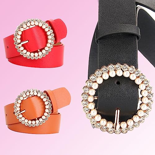 Leadigol PU Leather Pearl Belt, Vintage Round Buckle Women's Belt, Faux Leather Jeans Belt, Casual Buckle Waist Belt 7
