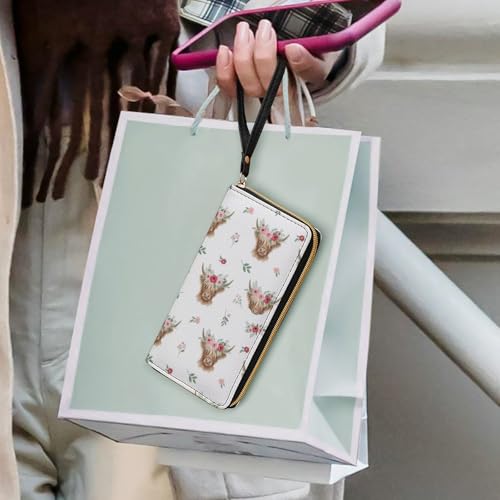 Womens Wallet, Waterproof Pu Leather Card Holder Organizer Floral Cattle Highland Cow Zipper Long Purse with Multiple Card Slots 1