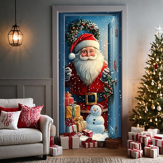 HOT ! Christmas Door Decorations Door Covers Xmas Santa Door Tapestry Pink Door Curtain Decoration Backdrop Door Banner for Front Door Farmhouse Holiday Party Decor Supplies Snowman Indoor/Outdoor