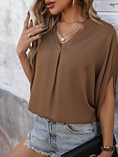 More information about Women's Shirt Blouse Solid Color Elegant Stylish Basic Short Sleeve V Neck Regular Tops Daily Blue Green Khaki Summer Spring