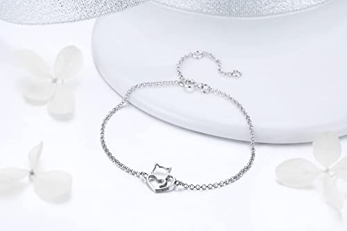 925 Sterling Silver Chain Bracelet with Cat Love Heart Charm Adjustable Plated Gold Bracelets with Chain Length 6.5in-7.9in, Best Jewelry Gift for Girls Women Cat Lovers 5