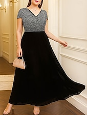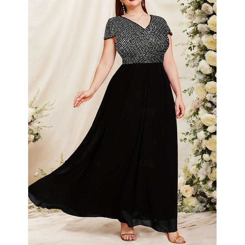 More information about A-Line Mother of the Bride Dress Black Dress Plus Size Sparkle & Shine V Neck Ankle Length Sequined Polyester Short Sleeve with Color Block