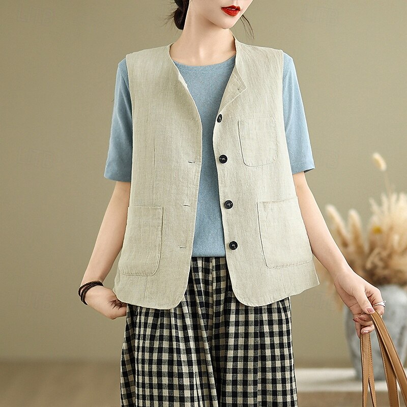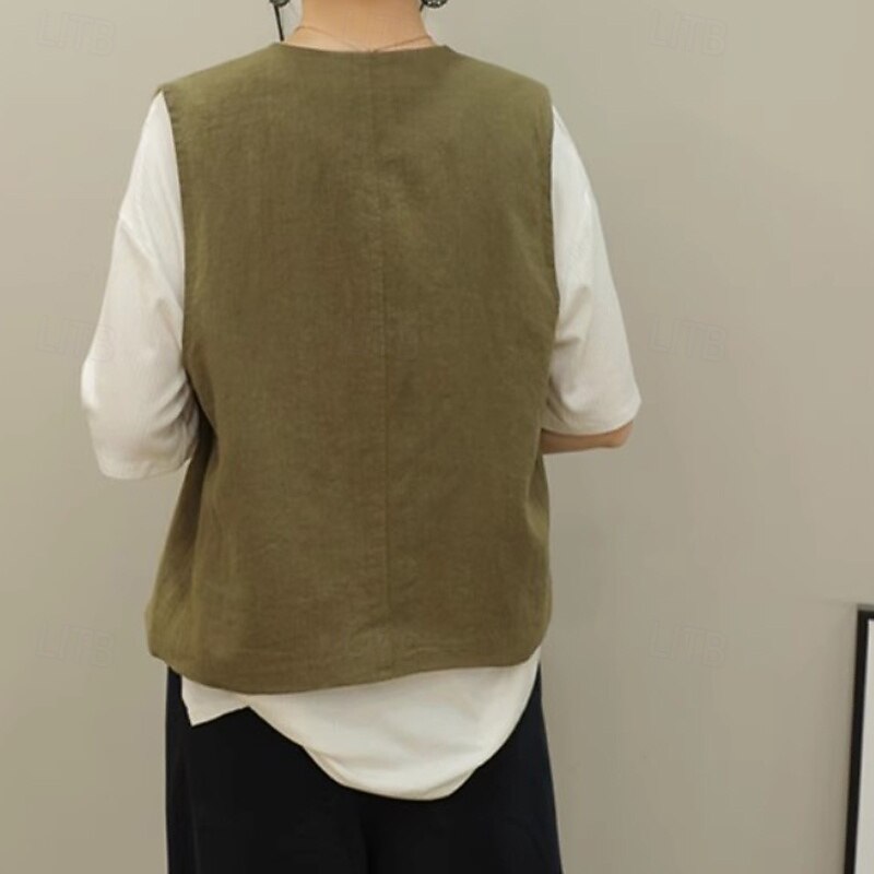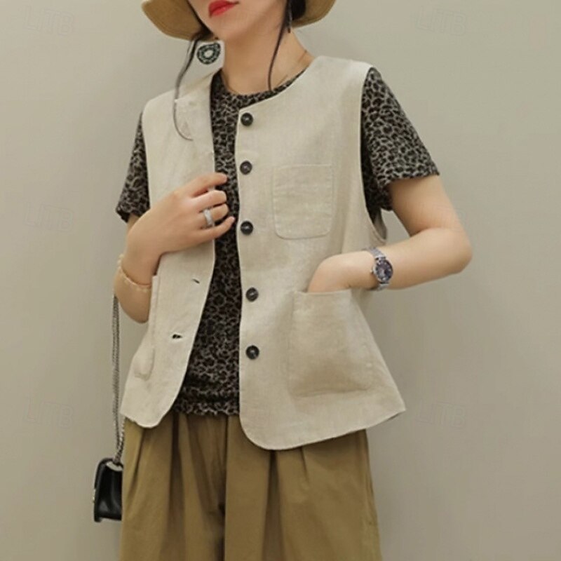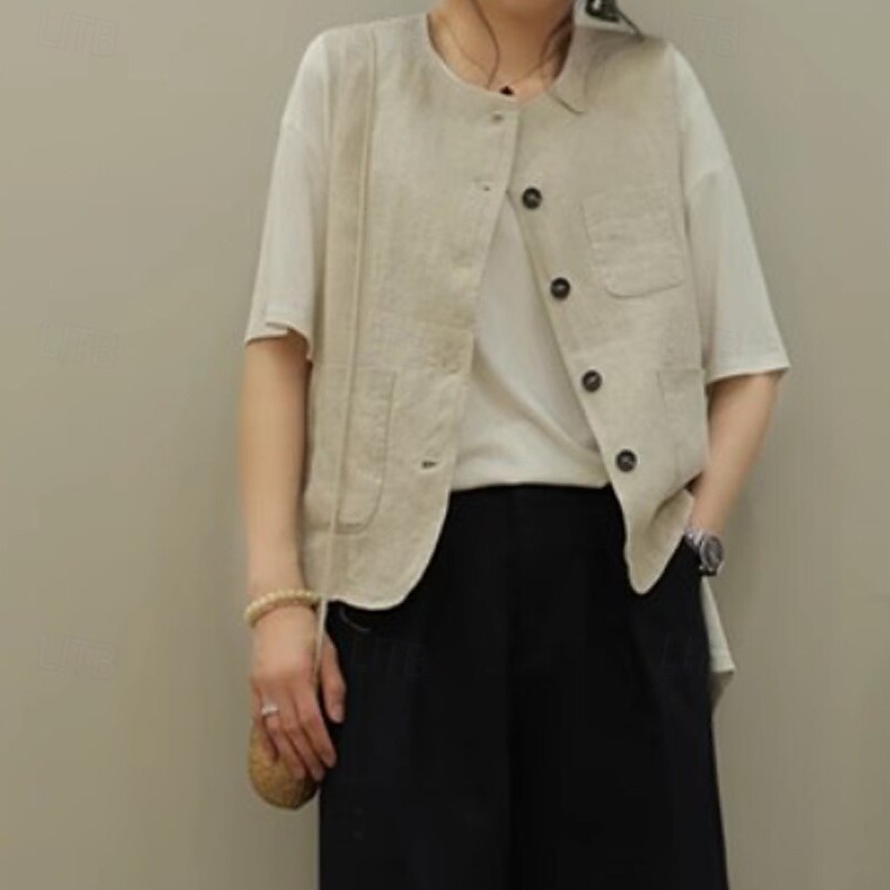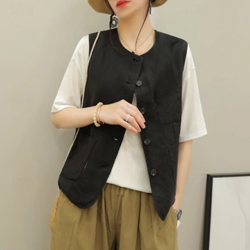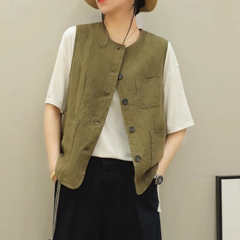 More information about Women's Linen-Inspired Shirts Plain Active Casual Sleeveless Crew Neck Regular Tops Daily Holiday Going out Buttons Pocket Black Green Apricot Summer
