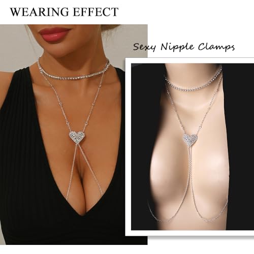 Heart Nipple Clamps with Chain Necklace Choker Non Piercing Fake Nipple Rings Silver Bra Body Chain Jewelry for Women 5