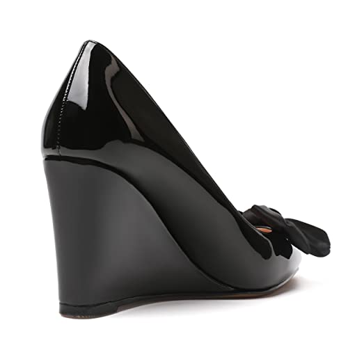 WAYDERNS Womens Slip On Casual Pointed Toe Solid Bow Dating Patent Wedge High Heel Pumps Shoes 3.3 Inch 5